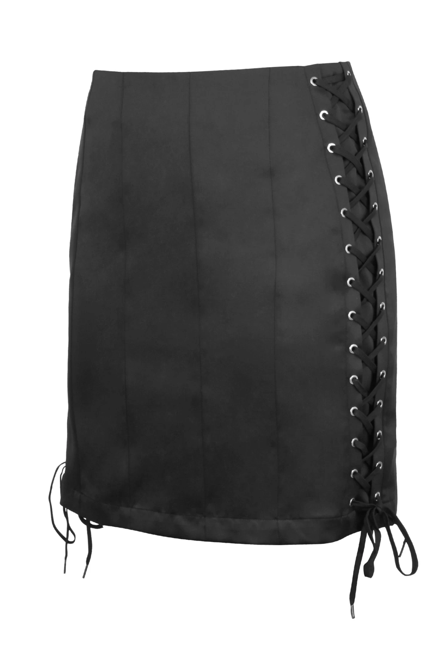- Design Details: Mini Length, Corset Style Lacing at Sides of Skirt, Zip Fastening