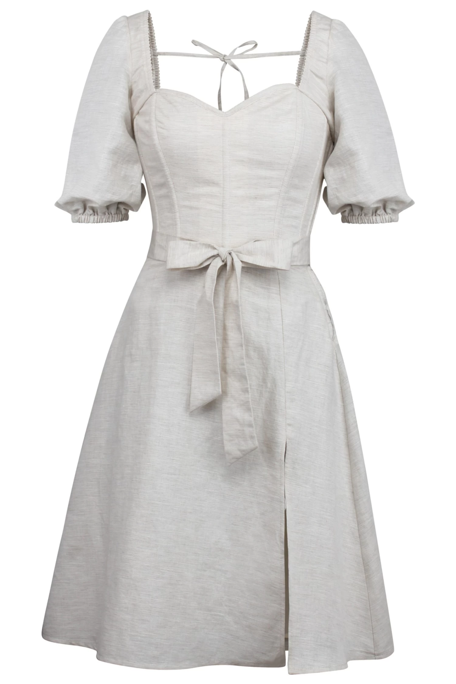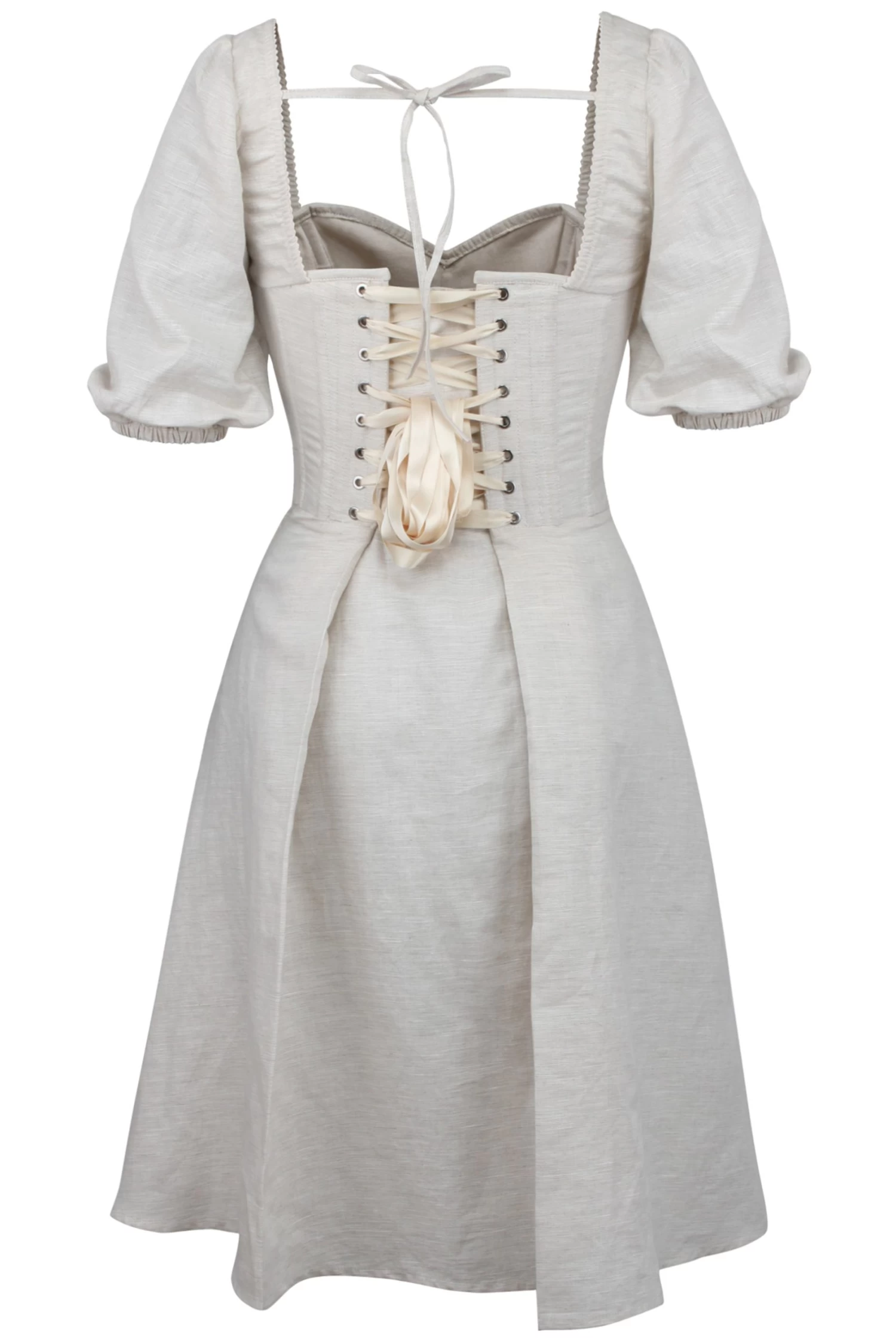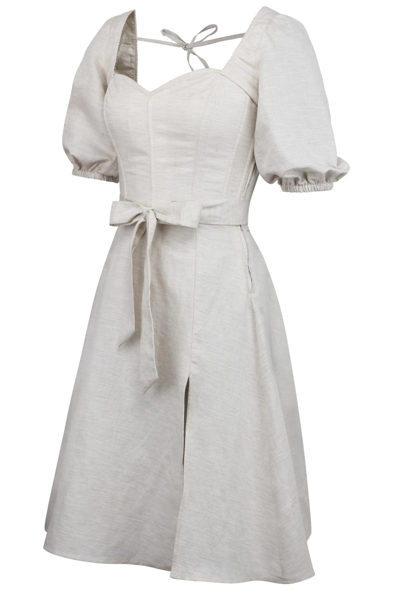 Ein zeitloses Korsettkleid aus einer Leinenmischung. „Gladiolus“ ist mit einem integrierten Korsett ausgestattet, das für Form und Halt sorgt. Wir haben eine Gürtelschnalle hinzugefügt, um die Taille weiter zu betonen, und hübsche Puffärmel, um den A-Linien-Rock auszubalancieren.