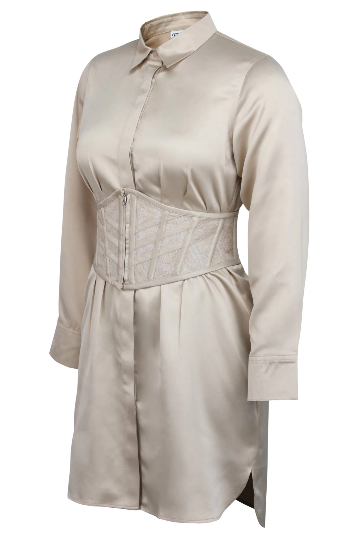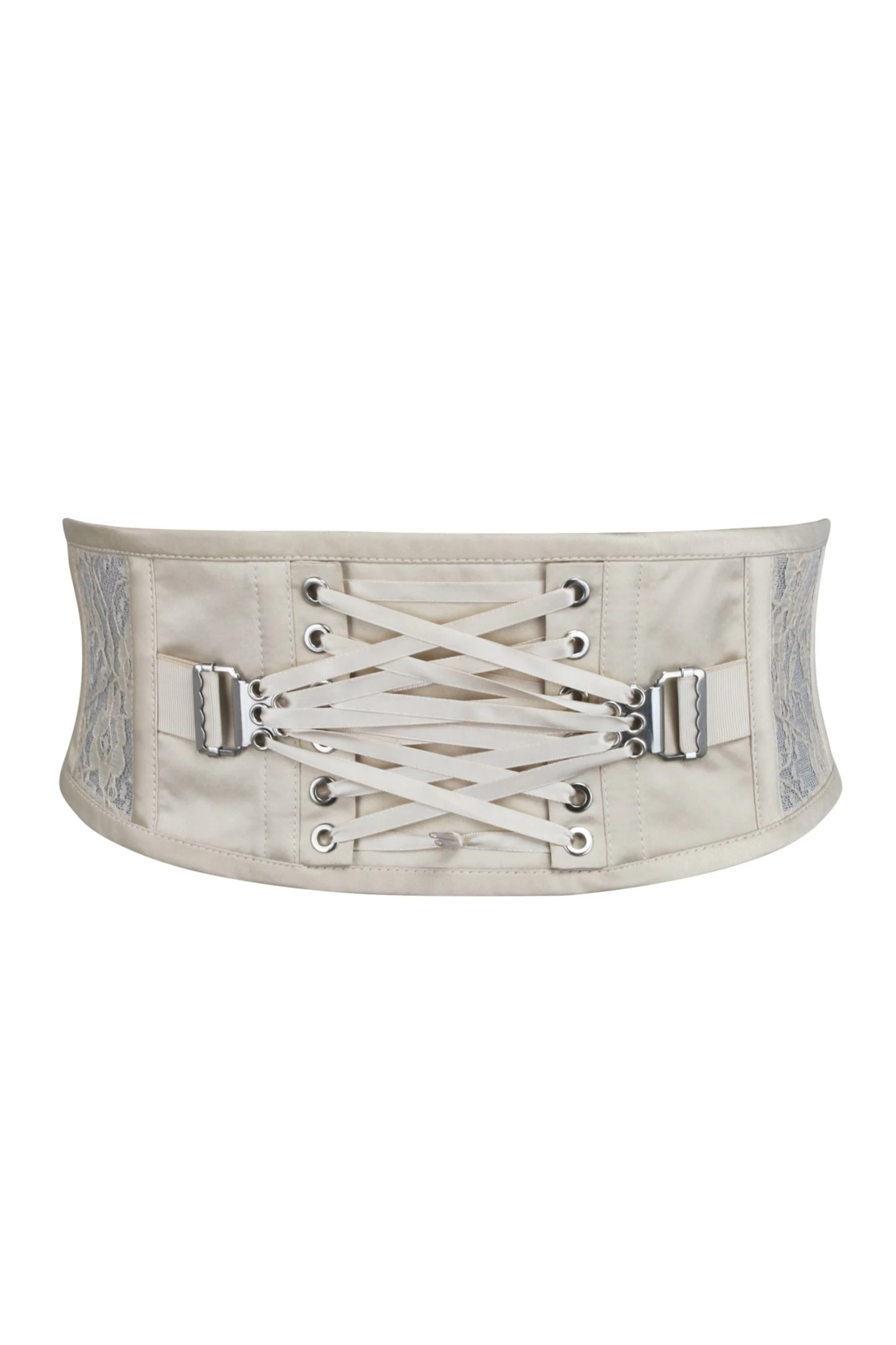 Dieser opulente, champagnerfarbene und samtweiße Gürtel ist ein echter Hingucker in Ihrem Kleiderschrank. Die nicht verstellbare Fächerschnürung sorgt für einen klassischen optischen Korsetteindruck, während der Reißverschluss an der Vorderseite ein einfaches Anziehen des Korsetts ermöglicht.