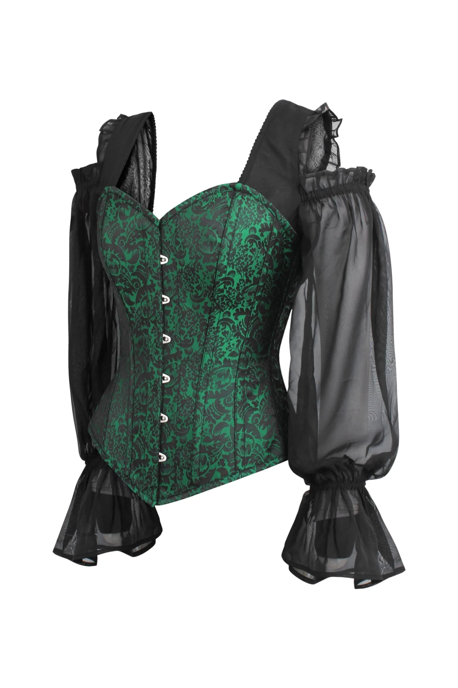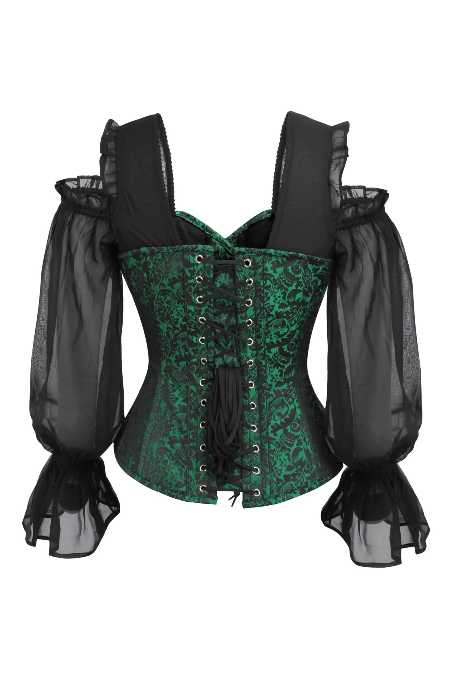 Dieses tolle schwarz-grüne Korsett-Oberteil aus Brokat wurde als Oberbekleidung entworfen und ist das perfekte Statement-Teil. Das elegante Korsett mit den langen Chiffon-Ärmeln ist eine ideale Alternative für alle, die ihre Weiblichkeit akzentuieren möchten und es bietet eine schmeichelhafte Abdeckung des Arm- und Schulterbereichs. Die Träger, die die Schultern offen lassen, machen dieses Modell nicht nur bequem, sondern auch diskret und raffiniert.