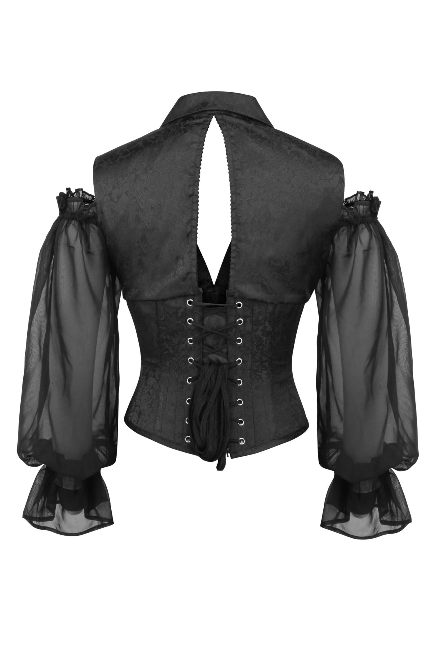 In diesem luxuriösen Unterbrust-Korsettoberteil aus schwarzem Brokat vereinen sich alle Eigenschaften, die Sie sich von einem Korsett wünschen können. Die langen gerüschten Ärmel kaschieren und schmücken Ihre Arme und die offene Schultern- und Rückenpartie macht das ganze kokett. Das Korsett hat vorne einen Reißverschluss – großartig für Korsettneulinge.