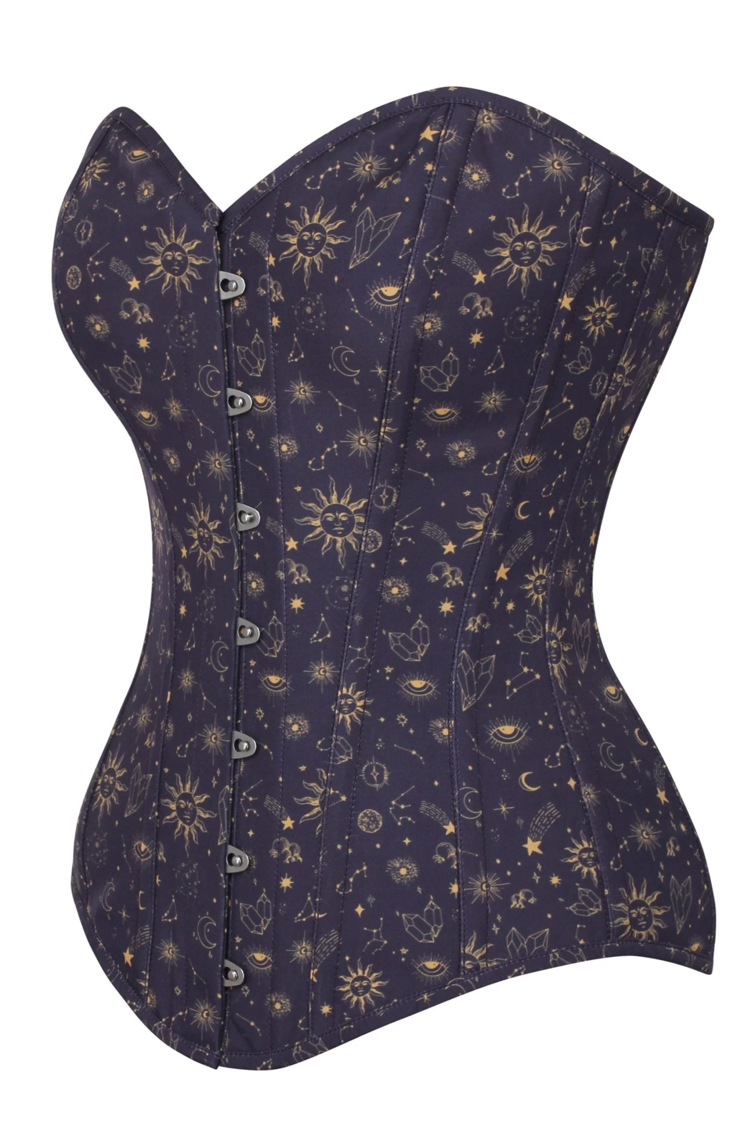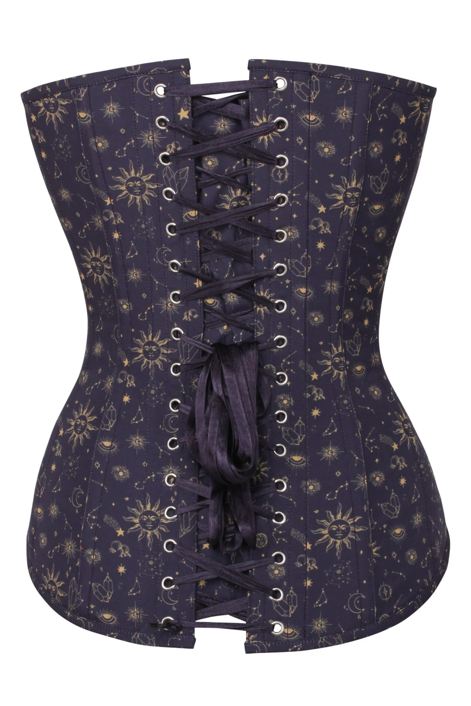 - Designmerkmale des Korsetts: indigoblauer und goldener Astronomiedruck