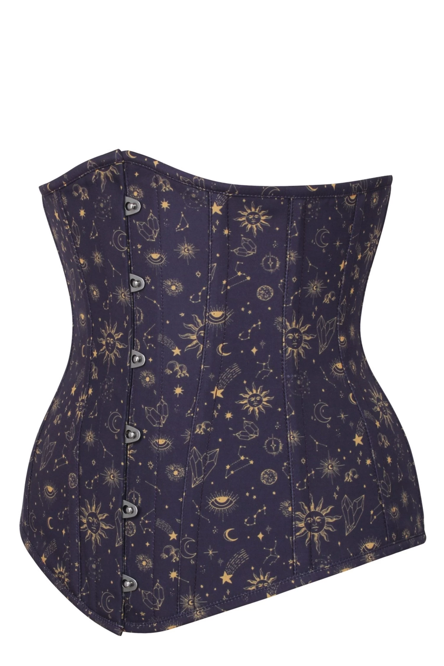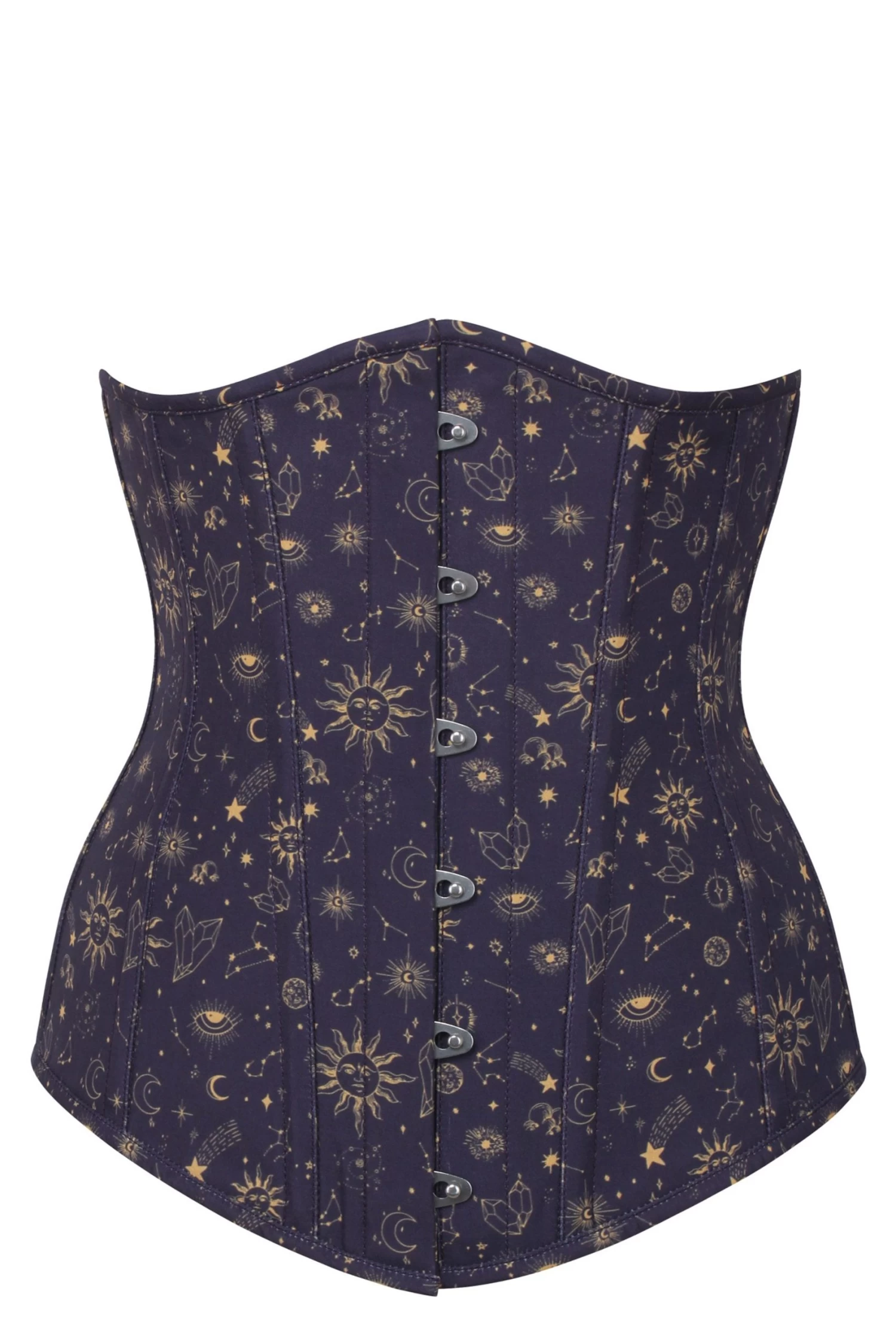 - Designmerkmale des Korsetts: Astronomiedruck in indigo und gold