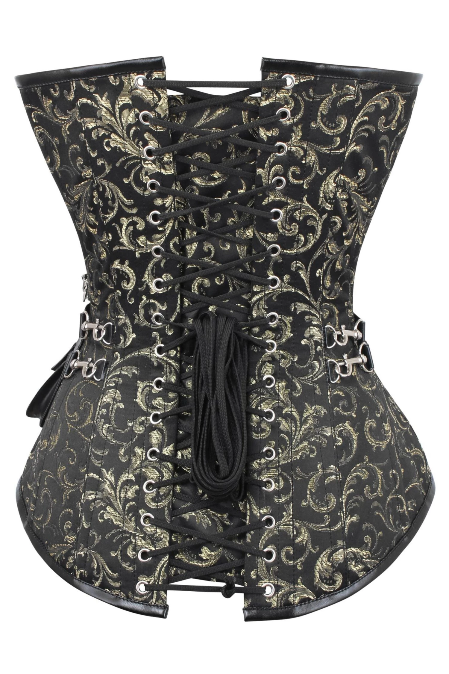 Goldener Brokatstoff und schwarzes Kunstleder – ein Paar vereint im Steampunk Himmel?! Dieses atemberaubende Design wird definitiv Aufmerksamkeit erregen mit einer niedlichen doppelten Tasche und einem Gürtel für eine militärische Note. Mit einer eindrucksvollen Taillenreduzierung von bis zu 4 Zoll, dass ist das Design welches Sie für die Super-Silhouette brauchen!