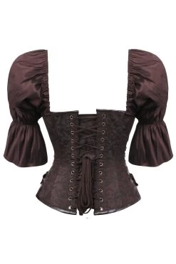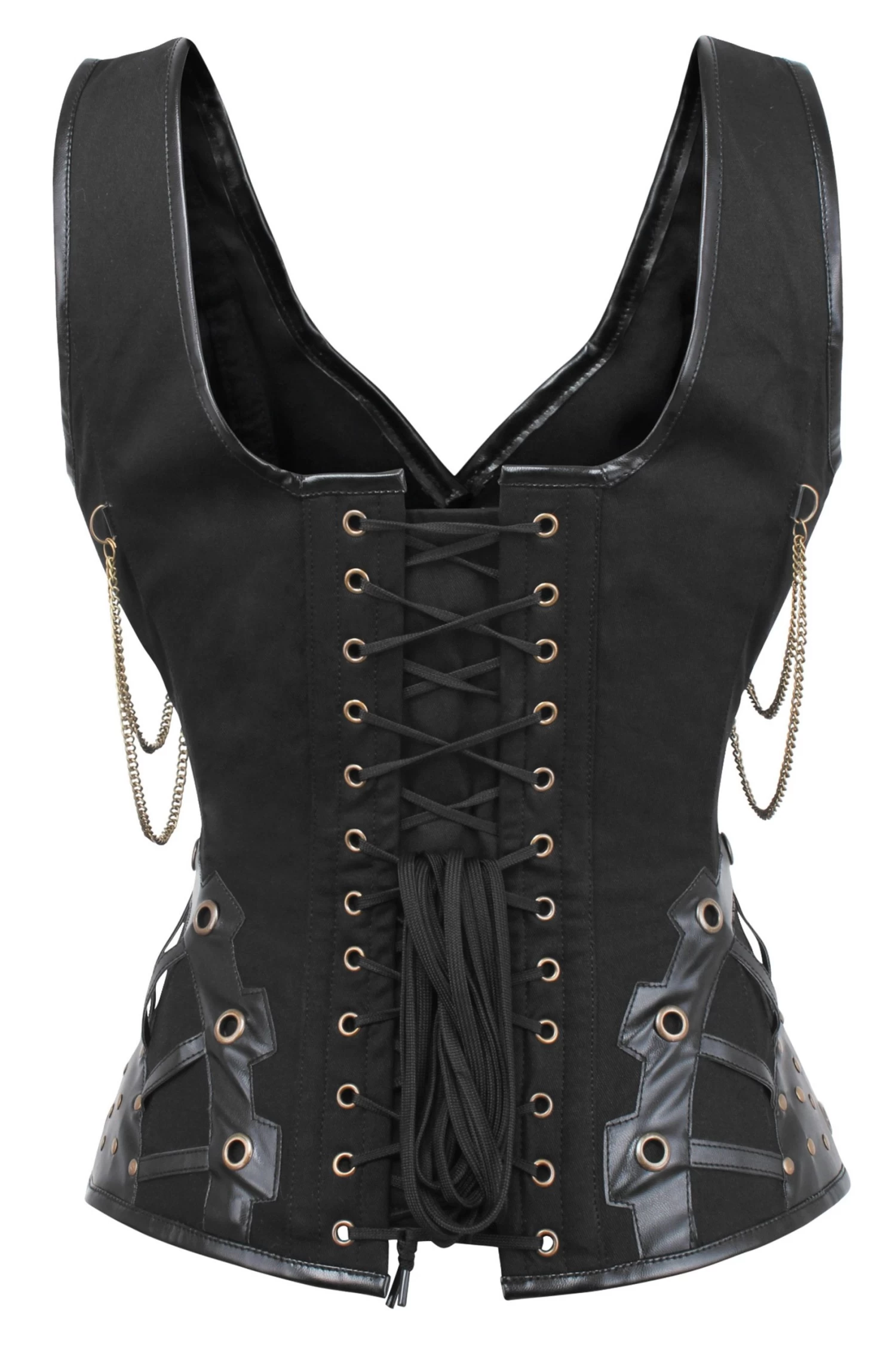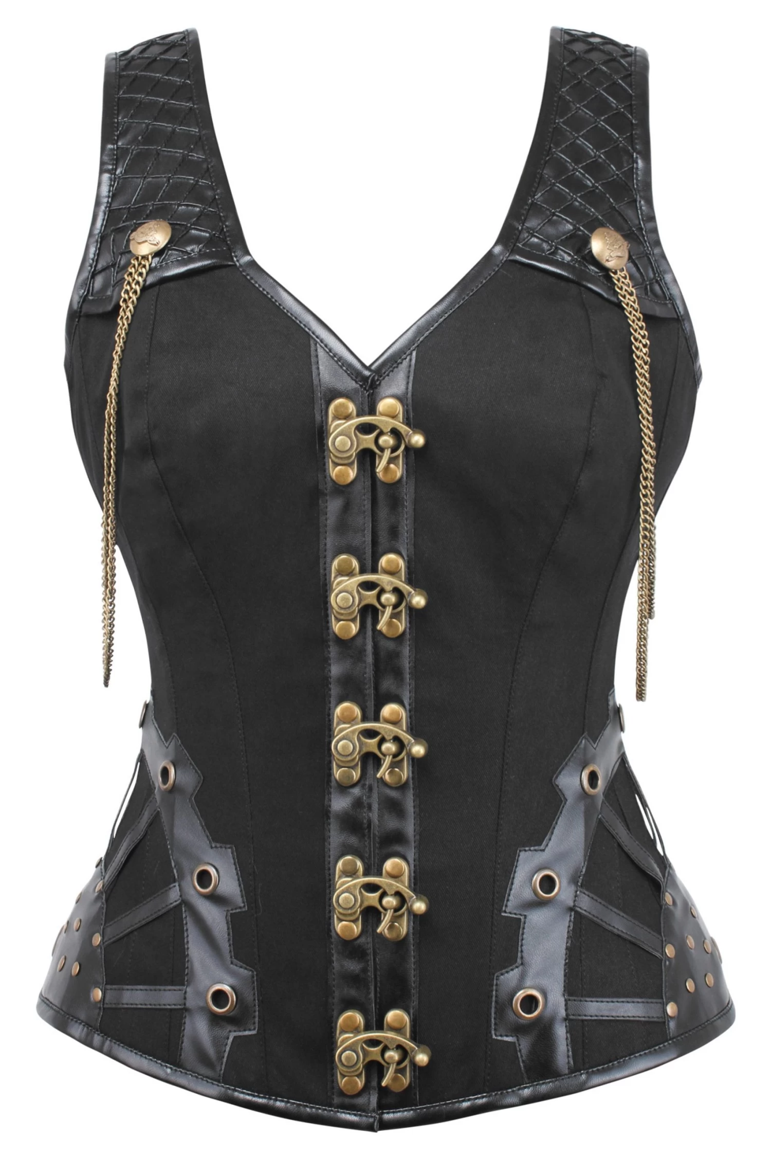 - Designmerkmale des Korsetts: gesteppte Kunstlederträger, Schnallen und Ketten, Steampunk-Hakenverschlüsse, Steampunk-Appliqué mit Ösen und Druckknöpfen, Hüftzwickel