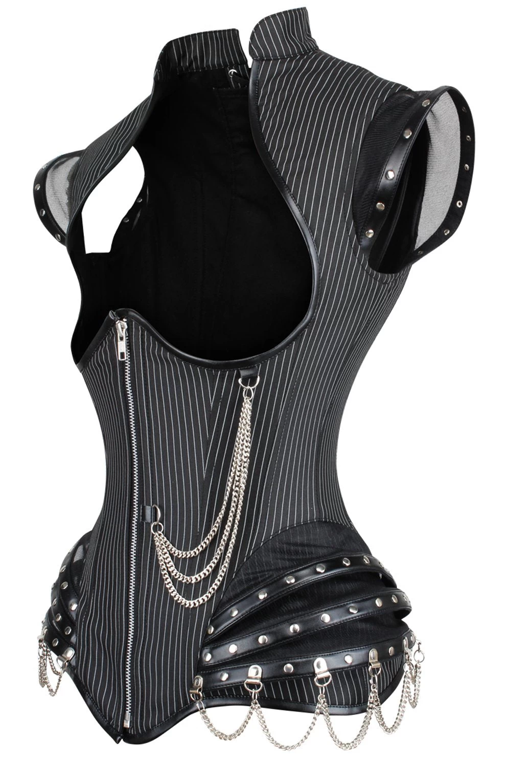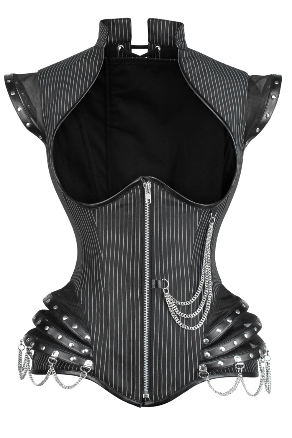 Dieses Korsett ist einfach alles: Gothic, Steampunk und sogar ein bisschen Weltraumschurke. Unser Unterbrust-Korsettoberteil hat einen hohen Kragen und Netzärmel und ist ein ideales Oberbekleidungsstück. Mit den Metallketten und den nietenbesetzten Hüftpolstern aus PVC drücken Sie jedem Anlass einen sexy und autoritären Stempel auf. Perfekt zu einem Nieten-BH.