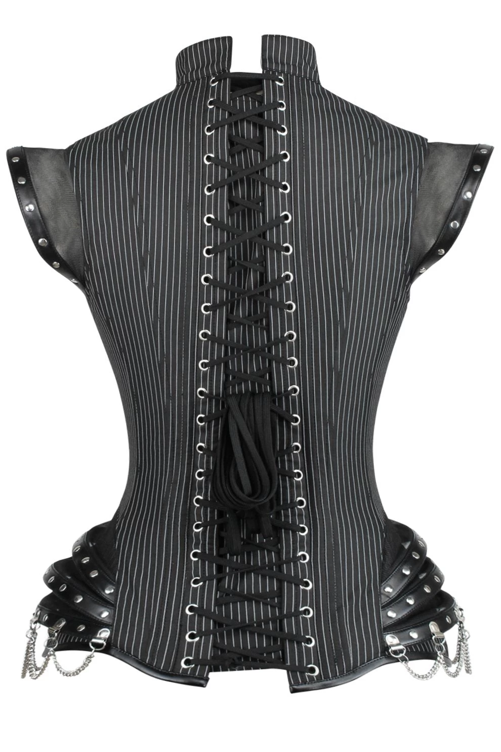 - Korsettmerkmale: Kordelschnürung, Hüftzwickel, Reißverschluss vorne, dekorative Ketten, Schultern & Kragen