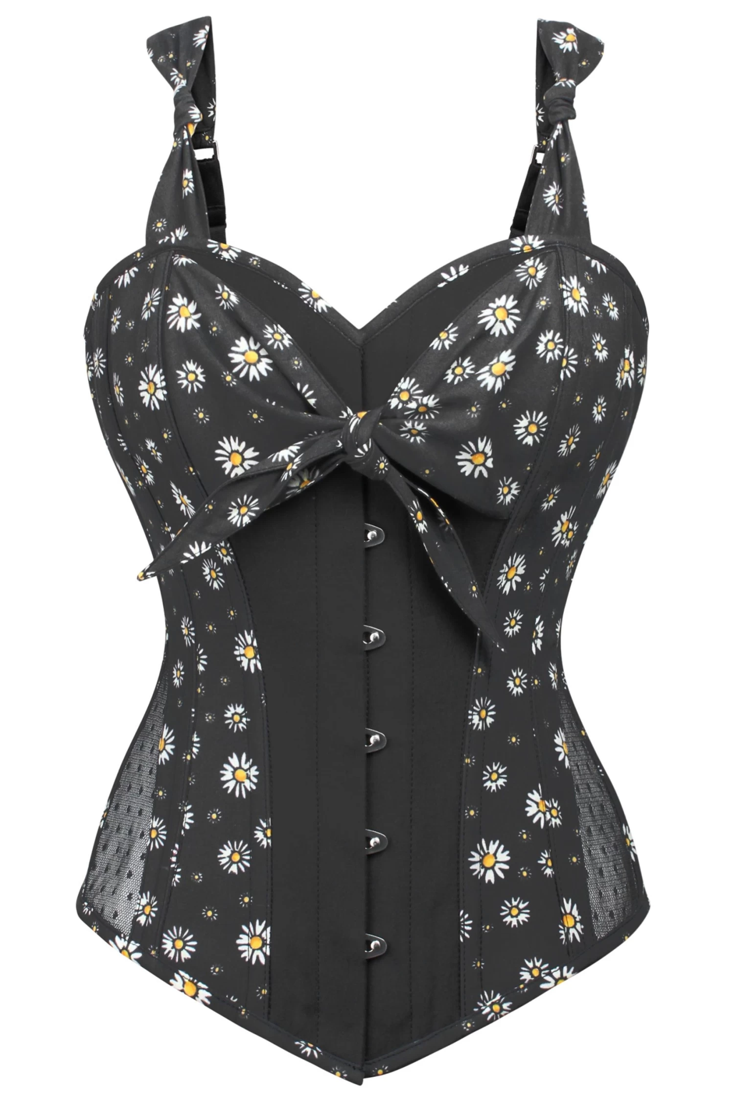Präsentieren Sie Ihren inneren Rockabilly Schick, mit diesem bezaubernd Americana inspirierten Korsettoberteil. Verfügbar in zeitlosem Schwarz, dieses Stück rockt die wunderschöne 50er Jahre Schärbe über der Brust und einem hellen Gänseblümchen Muster aus Baumwolle, um die bestmögliche Bequemlichkeit und Atmungsfähigkeit zu liefern und dass das ganze Jahr. Gelbe Schnürung auf dem Rücken ergänzt perfekt die erfrischenden Netzstoffeinsätze über der Hüfte, somit wird das Korsett perfekt abgeschlossen. Verstellbare Schulerträger liefern Ihnen Untersützung und geben dem ganzen Charakter für dieses verspielte Vintage Korsett. Sie werden außerdem eine sofortige Taillenreduzierung erleben, so wird Ihre Figur optimiert wie die der umwerfenden Damen der 50er Jahre!