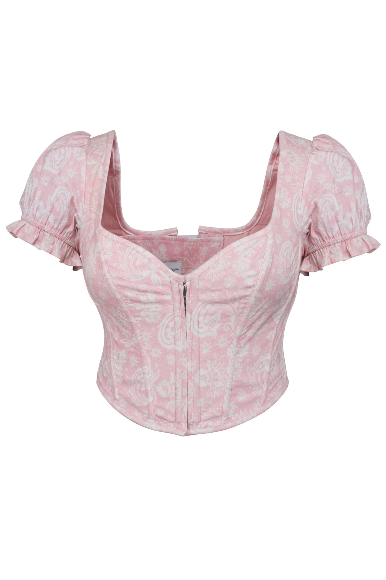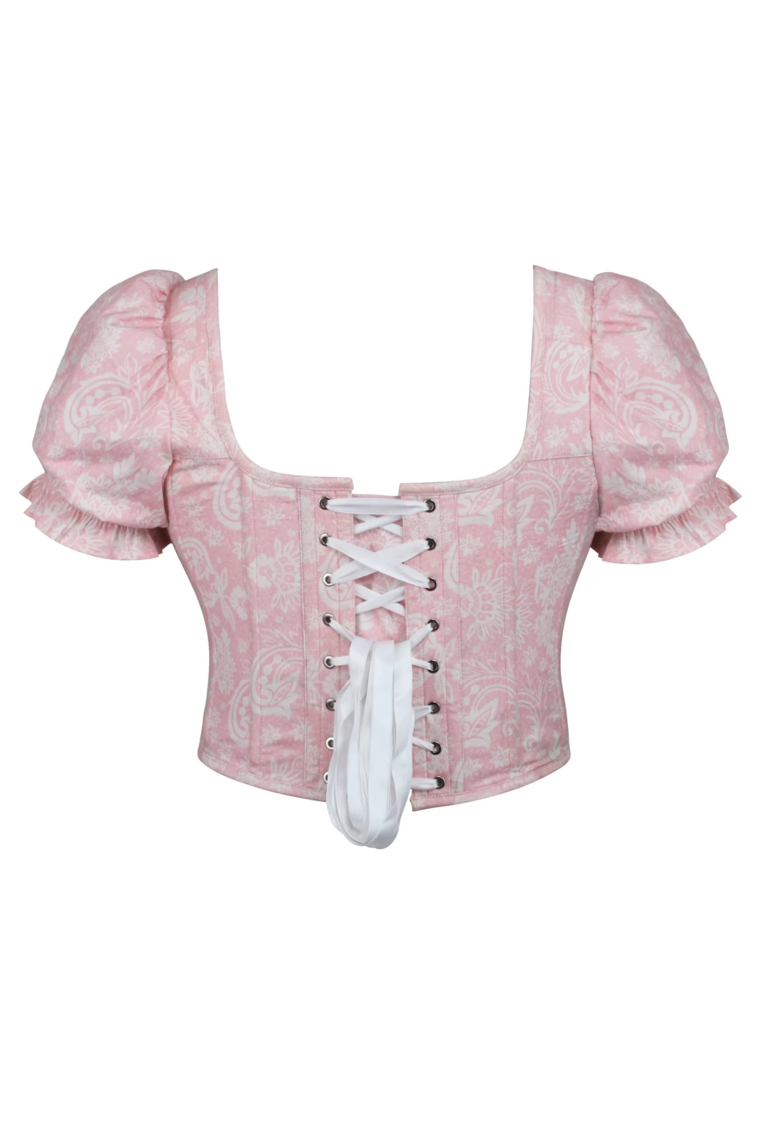 Dieses bezaubernde Korsettoberteil mit Spitzendruck wurde geschickt aus Stretch-Baumwolle gefertigt, um den Armen die nötige Bewegungsfreiheit zu geben. Das Mieder wurde jedoch fest angebracht, um die für ein funktionales Korsett erforderliche Festigkeit zu gewährleisten.